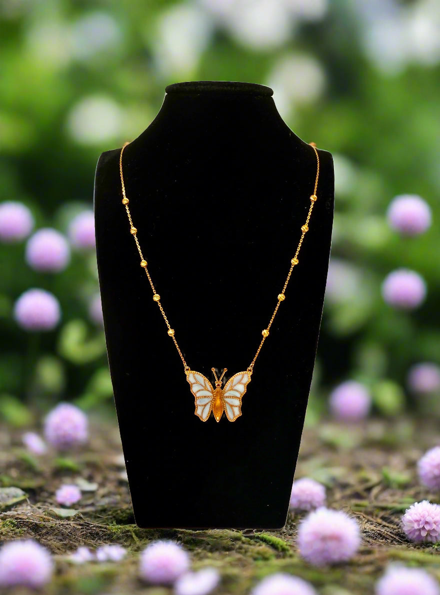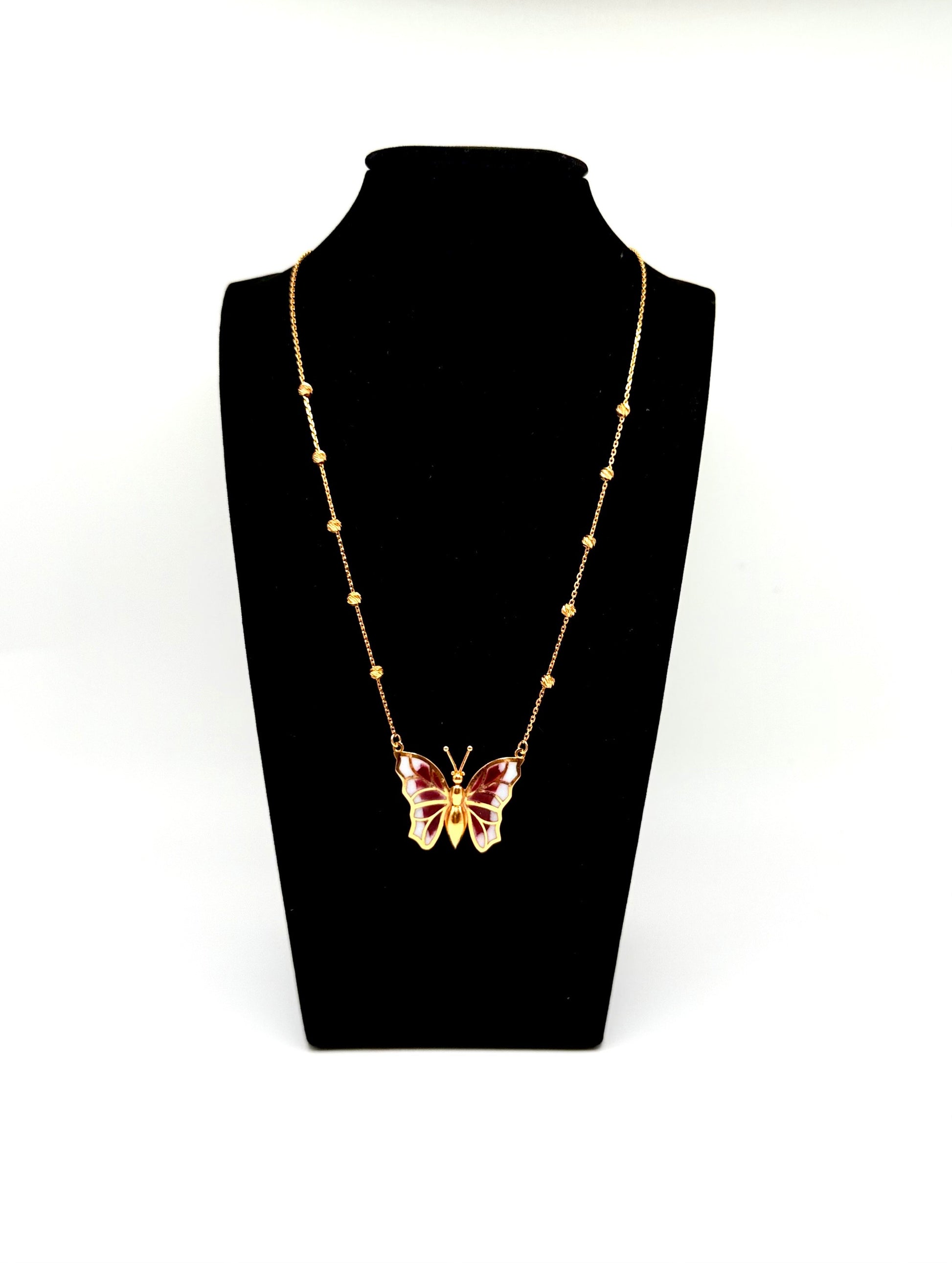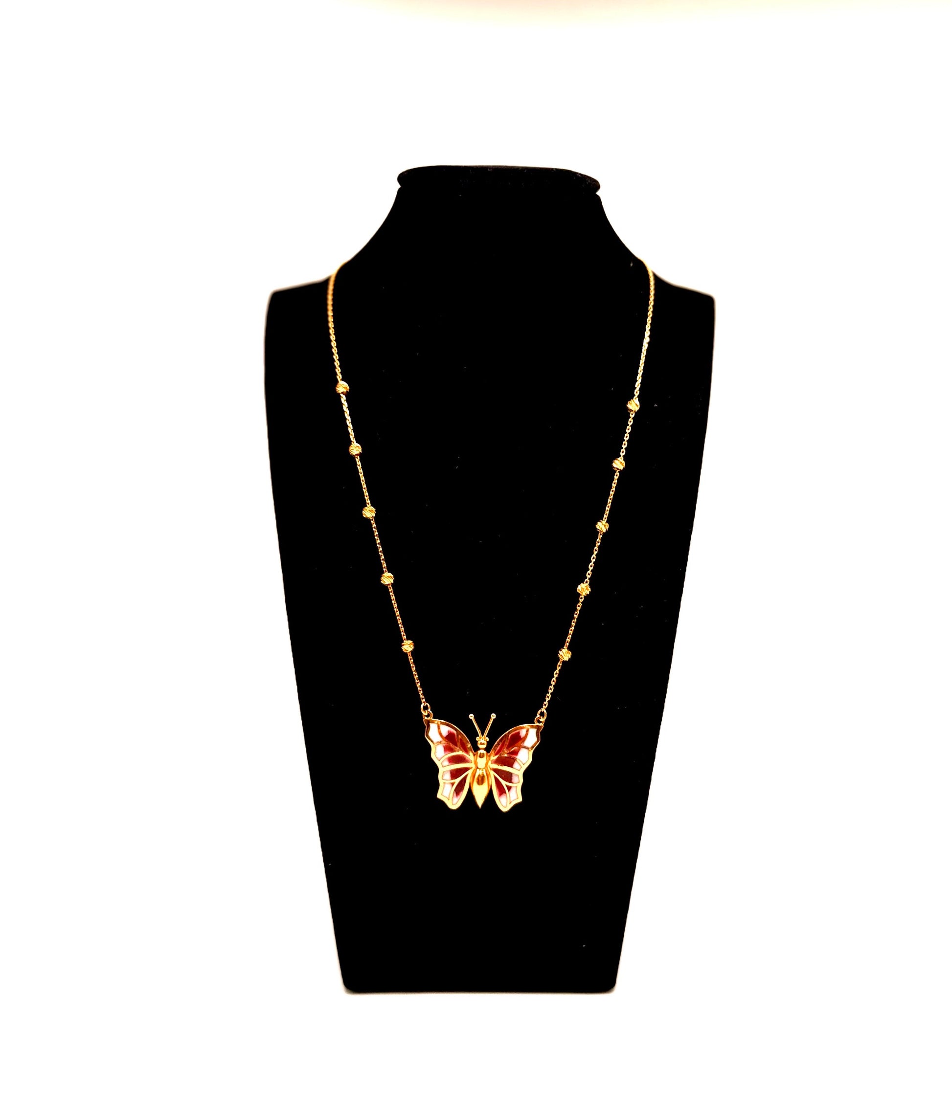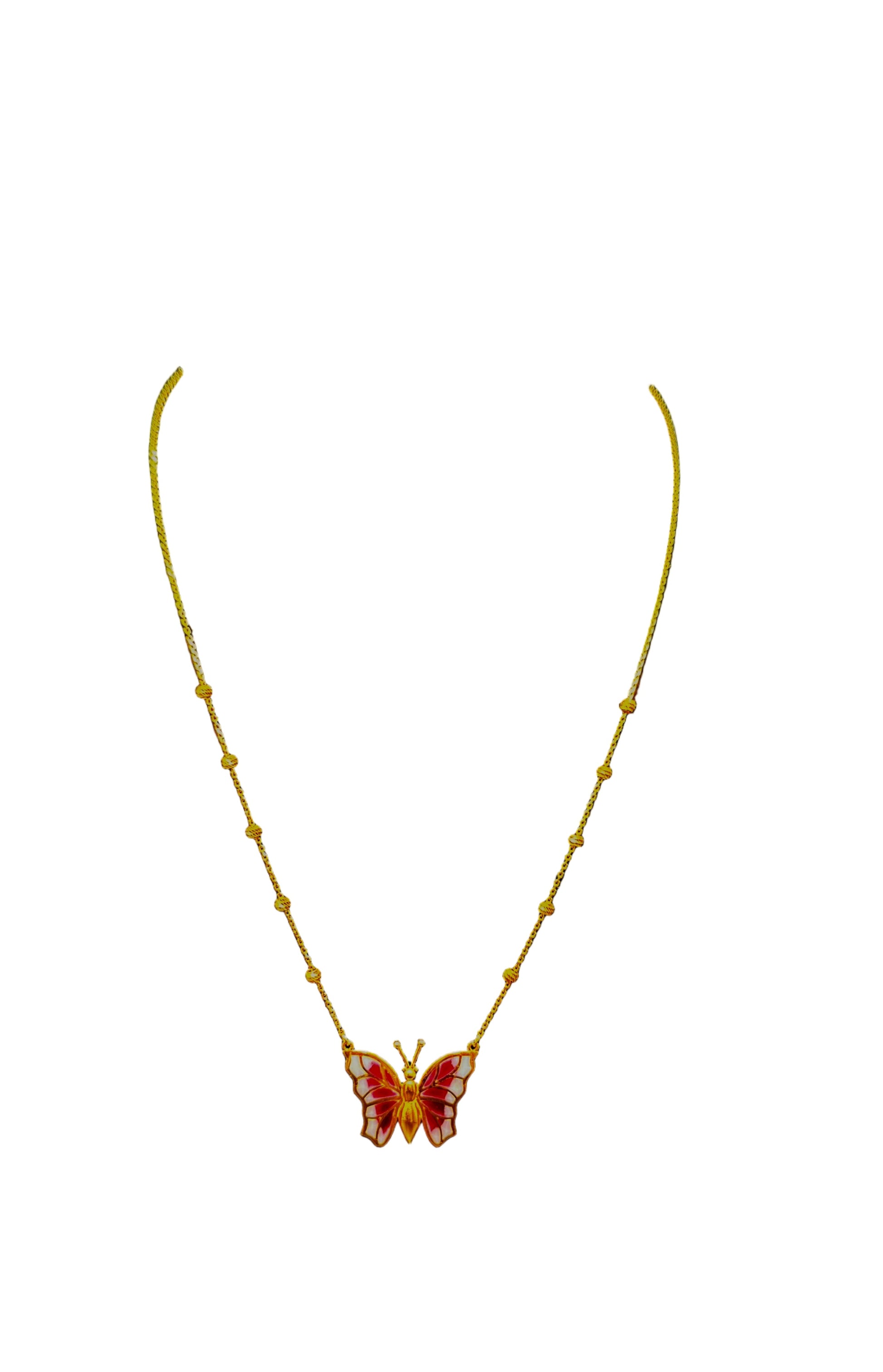 A stunning 21K gold butterfly necklace crafted with elegance and timeless detail. Chain length is 18.8" and total weight is 6 grams. Rich golden hue makes this piece stand out with pure beauty. Perfect for daily wear or as a treasured gift.